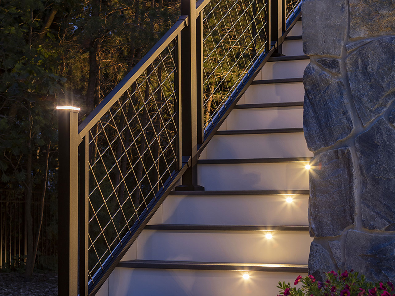 • Improves Safety and Visibility: Trex lighting provides a soft glow that helps illuminate stairs, railings, and deck edges for easier navigation after dark.