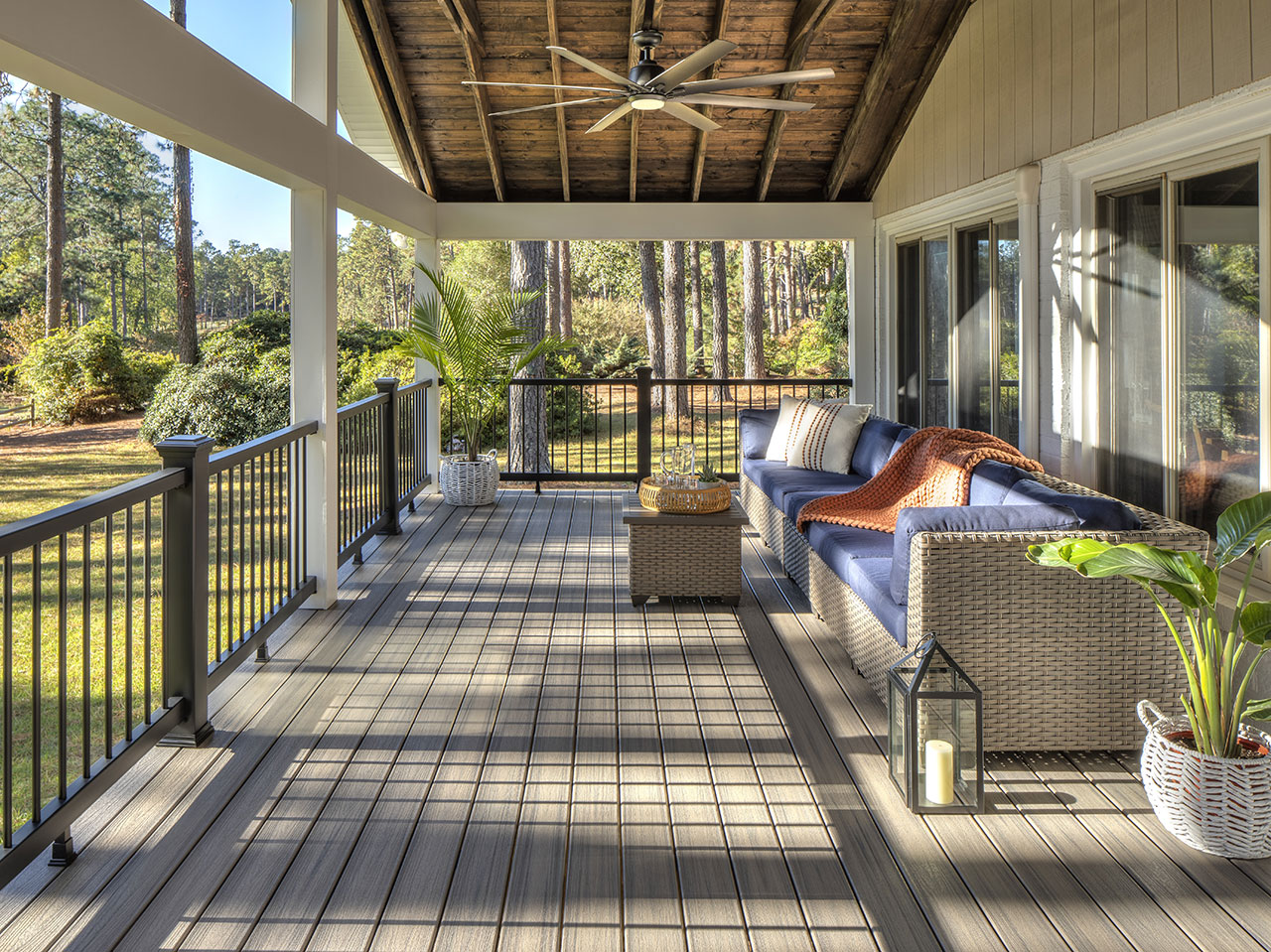 Ceiling-mounted fans for your covered deck can include integrated lighting.