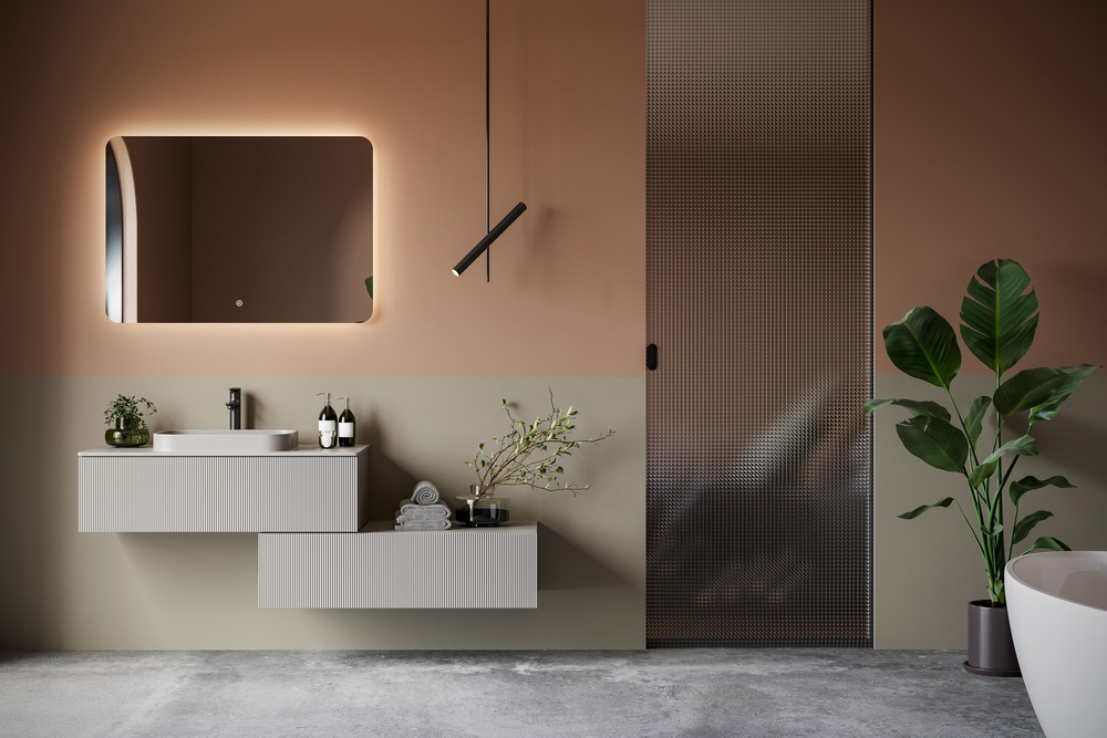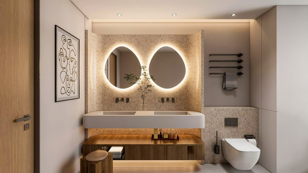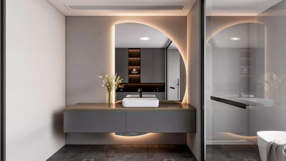 LED underlighting instantly elevates a floating vanity by emphasizing its floating effect. Soft lighting beneath the cabinet—and even integrated around your mirrors—adds depth and warmth while also improving visibility during nighttime use.